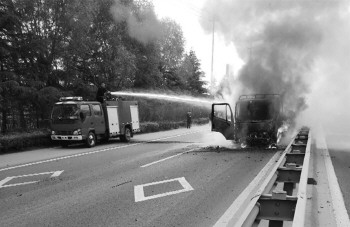 本报4月29日讯(记者 张焜 通讯员 李法臣 李晨日)一辆货车在行驶途中突然起火,诸城市公安局枳沟派出所民警驾驶驻站消防车第一时间赶到现场控制火情。消防员随后赶到,一同扑灭了大火。