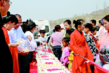 气球、花环、水枪、棉花糖年糕、塌煎饼、糖葫芦……从玩具到美食,本次桃花节上,当地村民就地捧起了“花饭碗”,吃起了“旅游饭”。更有“嗅觉敏锐”的商家店户做足“文化文章”,纷纷将自家产品融入古镇历史元素,身着汉唐服饰在桃花节现场销售,在万亩桃园中淋漓尽致地展现着汉唐历史文化魅力,市场持续火爆,更有一些群众因错过节庆活动商机,连呼遗憾。