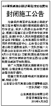为确保济南至青岛高速公路改扩建工程单幅双向通行期间道路通行及行车安全,保护人民群众生命财产安全,根据工程施工设计要求和专家评审意见,依据《中华人民共和国道路交通安全法》等规定,山东高速股份有限公司济青济南运管中心、山东省公安厅高速公路交通警察总队一支队历城一大队联合决定自2019年5月7日起至2019年6月15日对章丘(刁镇)收费站进行封闭施工,禁行车辆请绕行章丘西(白云湖)收费站或邹平东收费站。