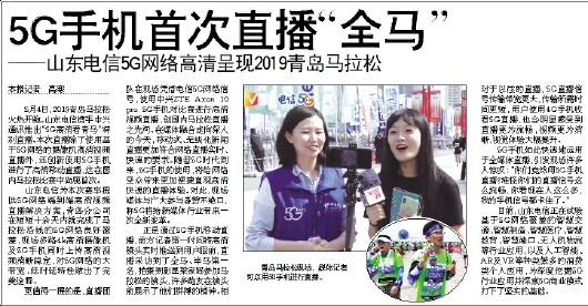 5月4日,2019青岛马拉松火热开跑。山东电信携手中兴通讯推出“5G高清看青马”特别直播。本次直播除了使用基于5G网络的摄像机高清视频直播外,还创新使用5G手机进行了高清移动直播,这在国内马拉松比赛中尚属首次。