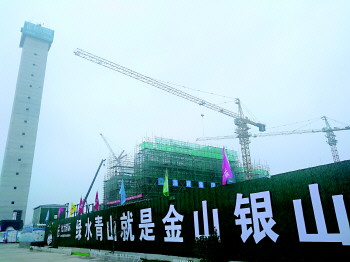 到达项目现场,记者一行人带上安全帽,在工作人员的引领下进入工地参观,远处是高耸的烟囱,近处围挡上的大字——“绿水青山就是金山银山”煞是引人眼球。