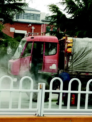 4月28日下午,周先生驾驶一辆满载饲料的大货车行至城阳双元路后海西社区附近时,突然发现车下部冒出白烟。他急忙停车查看,发现驾驶室下方有明火冒出。由于车上没有配备灭火器,周先生慌了手脚。他试图用篷布灭火,但由于着火位置在车下方,根本无济于事。此时,一辆919路公交车刚好从后面驶来,周先生赶紧跑过去求助。