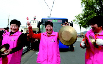 公交开进小山村 4月27日,宁津街道东苏家村,村民们用最朴实的仪式迎接383路无人售票公交车进村,小山村从此告别了不通公交车的历史。东苏家村位于甲子山脚下,村民出行得走到5里多地的主公路等车。随着美丽乡村建设,管理区将东苏家村纳入“十里古乡”旅游路线进行统一规划,修宽道路,设定站点,安装站牌,将城市公交383线直接开进了东苏家村,打通了村民出行的“最后一公里”。 石炫 于佳佳 摄