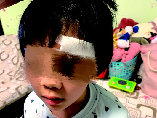 ◤妮妮眉骨破裂缝了8针。