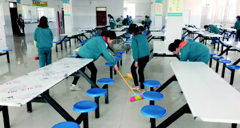 爱劳动实践 为引导学生崇尚劳动,五一劳动节之际,沂源县鲁村镇中心小学开展了“我劳动,我光荣,我快乐”清扫食堂卫生活动。(董其永 王艳艳)