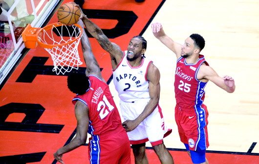 相比西部,东部半决赛另外一场抢七来得更刺激、更激情。终场前4.2秒,双方战至90平,猛龙握有最后一攻的机会,球来到了莱纳德(球迷昵称小卡)手里,他持球到右侧底角,在恩比德高高跃起的封盖中出手,球画出一道高高的弧线奔向篮筐,在篮筐足足弹了四下之后颠了进去,沉寂,然后是整个多伦多美航中心球馆的彻底沸腾。92:90,赢球后的猛龙同雄鹿会师东部决赛。一个是单骑救主,面无表情的冷血杀手莱纳德,另一个是无所不能,飞天遁地的希腊怪兽“字母哥”(扬尼斯·阿德托昆博),16日上午8点半,两个超人的PK正式开始。