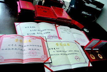 ◥刘奇光荣获的部分证书和勋章。