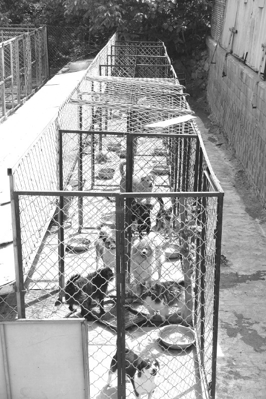 王师傅在中心工作时间最久,在他的带领下,记者参观了后院的部分狗舍。由于地势的原因,后院被分隔为高低两部分,约20排狗舍被统一编号。每个笼子里都有狗,少的三四只,多则六七只。