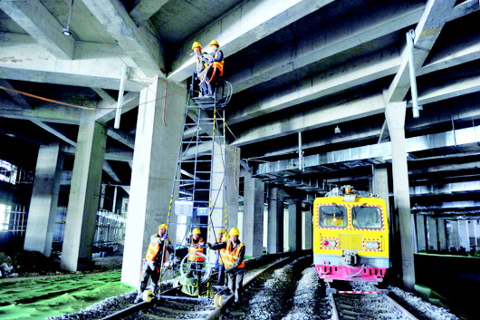 济南轨道交通R3线车辆段内,中铁电气化局施工人员正在已铺好的轨道上进行接触网拉线。本报记者 王媛 摄