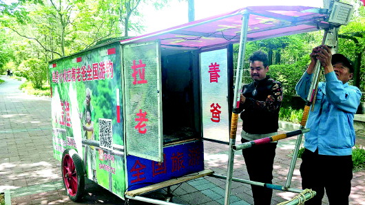 5月14日,在泉城公园附近,小伙盖俊峰和父亲一起收拾自制的“房车”。盖俊峰今年27岁,去年父亲被查出心血管疾病。为了陪父亲散心徒步旅游,盖俊峰陪着老人从河北沧州出发,徒步几百公里,穿越了15个市县,花了半个月的时间来到了济南。 本报记者 李震 摄