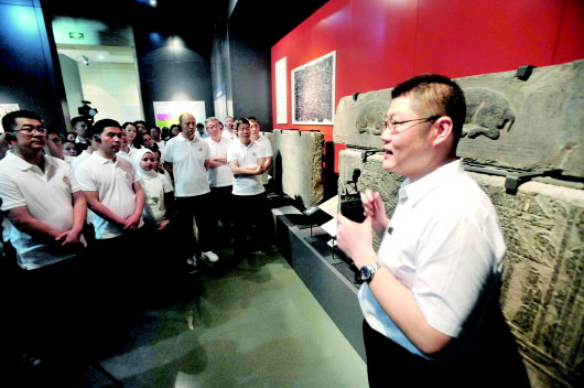 17日晚,在山东博物馆,专业人士正在向嘉宾讲解汉代画像石刻艺术。本报记者 张中 摄