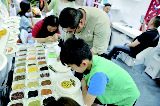 5月17日,深圳文博会进入第二天,山东展区东明粮画展位,展商准备了二十多种粮食供参观者现场体验粮画,每天有上百人来这里体验。图为一名小朋友正在试着制作粮画。 本报记者 时培磊 摄
