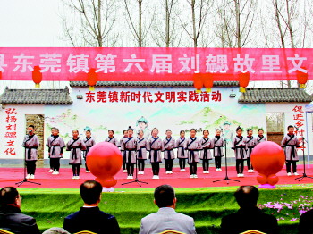 ◎ 文化旅游焕生机 “……心生而言立,言立而文明,自然之道也。”4月7日,农历三月初三,在绵绵的春雨之下,在大沈庄小学学生诵读《文心雕龙》选段的朗诵声中,在大沈庄刘庄村刘勰大舞台上,东莞镇第六届刘勰故里文化旅游节拉开序幕,县文化和旅游局党组副书记、主任科员王海涛和刘勰故里文化研究会会长刘润义在现场为刘勰故里乡村记忆馆揭牌。来自青岛、临沂、潍坊等地的游客前来参观,一时宾客如云、少长咸集。