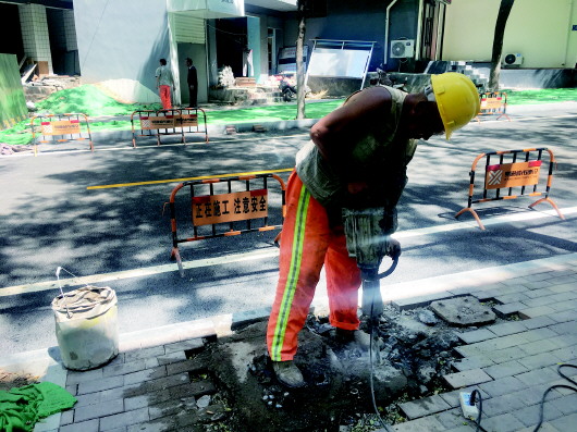 记者看到工人在作业时,手臂上的青筋已经暴起,钻头钻击地面时还有不少飞起的碎石直接打在工人的身上,由于长时间保持弯腰动作,工人肩膀和脖子已经晒得发红。