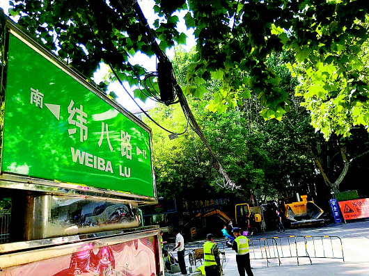 5月28日下午4点半,记者来到经五纬八路路口,发现路口北侧以及西南侧有多位施工人员正在施工,现场还设置了围挡以及护栏等,路边还停着多辆施工车辆。