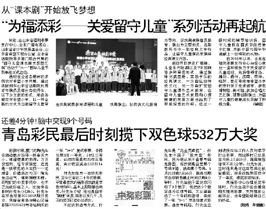 自2016年以来,山东省福利彩票发行中心与爱心单位一直积极致力于关爱留守儿童活动,先后带领青岛、潍坊、德州、济南、菏泽、临沂、枣庄等地市希望小学的农村孩子走进城市,参观博物馆、美术馆,参加合唱文艺汇演,观看话剧演出,为留守儿童的健康成长贡献了积极力量。 (钟欣)