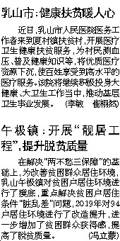 乳山市:健康扶贫暖人心   近日,乳山市人民医院医务工作者来到夏村镇扶贫村,开展医疗卫生健康扶贫服务,为村民测血压、普及健康知识等,将优质医疗资源下沉,使百姓享受到高水平的医疗服务。该院将继续积极投身大健康、大卫生工作当中,推动基层卫生事业发展。 (李敏 崔栩然)         午极镇:开展“靓居工程”,提升脱贫质量   在解决“两不愁三保障”的基础上,为改善贫困群众居住环境,乳山午极镇对贫困户居住环境进行了摸底,重点解决贫困户居住条件“脏乱差”问题,2019年对94户居住环境进行了改造提升,进一步增加了贫困群众获得感,提高了脱贫质量。  (冯立蒙)