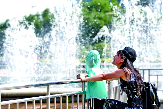 3日下午,市民在泉城广场音乐喷泉边享受丝丝凉意。 齐鲁晚报·齐鲁壹点记者 王鑫 摄