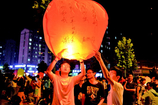 “过线了!过线了……”6月2日晚11时,大别山深处的安徽省六安市毛坦厂镇,在距离毛坦厂中学东门200米远的法治文化广场上,聚满了学生和陪读家长。他们在孔明灯上写下心愿,点亮,双手高举,徐徐放飞。当孔明灯越过广场北侧的两排电线时,人群中发出一阵欢呼。合肥学院大四女生田文静也在现场,她是陪在毛坦厂中学读“高四”的弟弟来的。四年前,同为毛坦厂中学“高四”学生的她,也在这里放飞过承载自己梦想的孔明灯。