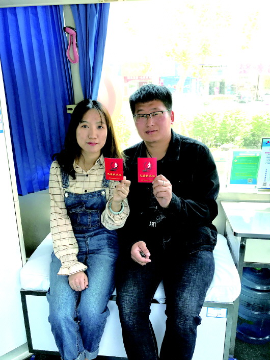 近日,青岛市即墨献血服务部佳乐家的爱心献血车迎来了一对甜蜜的恋人宋永晖和女朋友许青青。两人见证爱情、携手捐献血液,此次两人共捐献全血700毫升。 (何丽芹 摄)