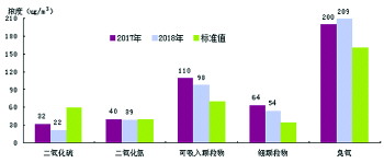 细颗粒物作为首要污染物的天数95天,占监测总天数的26.0%,比上年减少36天;可吸入颗粒物作为首要污染物的天数64天,占17.5%,比上年减少16天;二氧化氮作为首要污染物的天数22天,占6.0%,比上年增加9天;臭氧作为首要污染物的天数为158天,占43.3%,比上年增加35天。