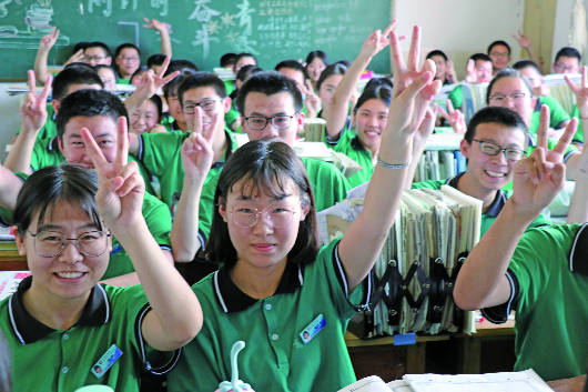 高三学子们做出胜利的手势。