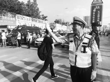 郭华在考点外疏导交通。 齐鲁晚报·齐鲁壹点记者 褚思雨 摄