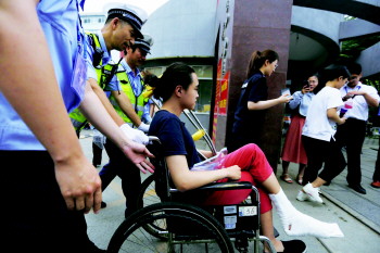 考生术后行动不便,特警人员全程护送