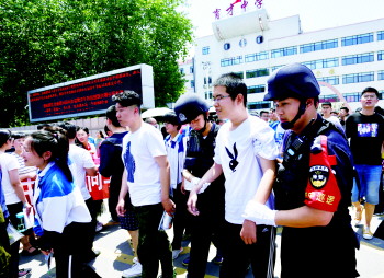 市中公安分局特警大队副大队长范晓波了解情况后,立即派两名执勤人员护送考生进入考场。“考生的考场在2号楼五楼,我和同事搀扶他进入考场,同时告诉他这两天他们全程护送他进出入考场,让他放平心态,轻松考试。”济宁市市中公安分局特警大队辅警分队长姜盟说,护送考生进考场他十分熟悉,去年高考时他同样在育才中学执勤,当时一名身高180厘米,体重200斤的考生因踢足球骨折,无法自己进入考场,求助执勤人员,姜盟和同事轮流将他背上五楼。“高考前,每年我们都会进行护送培训,去年的那位考生以650分的高分考入理想的学校,今年在护送这位考生时,我们也告诉他这个故事,让他不要有心理负担,肯定能取得理想成绩。”姜盟笑着说。