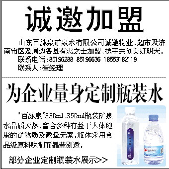 山东百脉泉矿泉水有限公司诚邀物业、超市及济南市区及周边各县有志之士加盟,携手共创美好明天。 联系电话:85196288 85196636 18553182119 联系人:崔经理 为企业量身定制瓶装水 “百脉泉”330ml、350ml瓶装矿泉水品质天然,富含多种有益于人体健康的矿物质及微量元素。瓶体采用食品级原料吹制而晶莹剔透。 部分企业定制瓶装水展示〉〉 诚邀加盟
