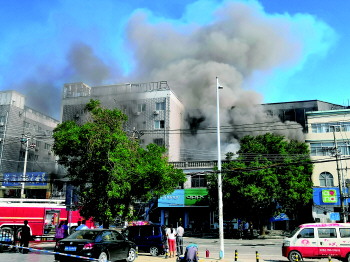 记者在现场看到,起火处系双河路北侧东西两栋紧挨的6层楼房,西侧楼房一楼为国美电器,东侧楼房一楼多为手机专卖店门市,两栋楼房高层为居住房。由于现场拉起了警戒线,记者并未看到明火,现场不断有滚滚浓烟冒出。