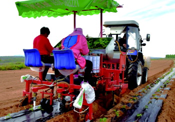 村民使用地瓜自动种收机栽种地瓜。