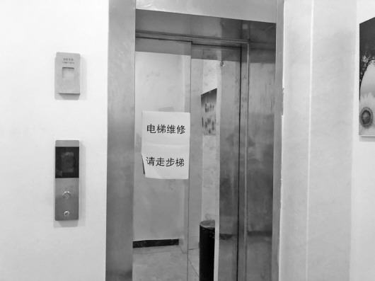▲6月12日,在梁山县都市118酒店内,仅有的一部电梯被贴上了“电梯维修 请走步梯”的通知。