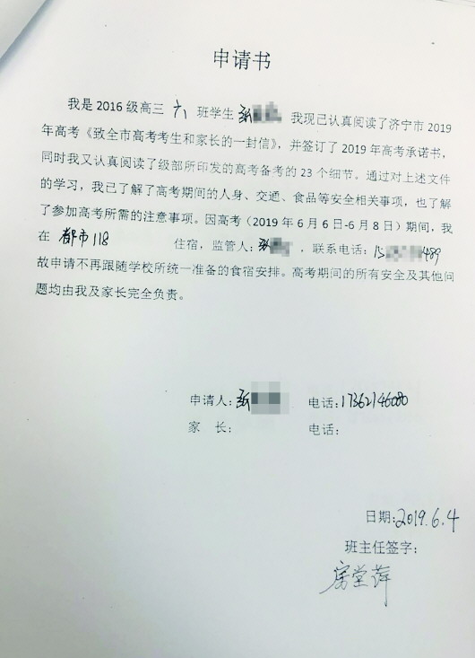◤入住酒店的考生小张递交的“不再跟随学校统一安排食宿”的申请书。