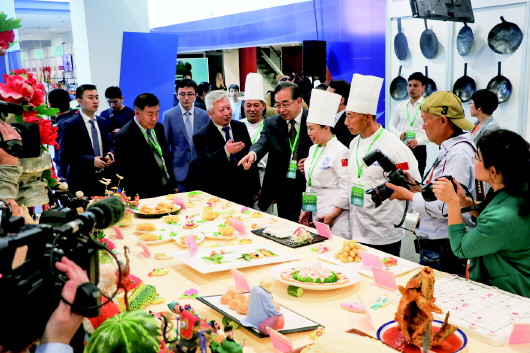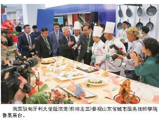 我国驻匈牙利大使段洁龙(前排左三)参观山东省城市服务技师学院鲁菜展台。