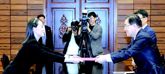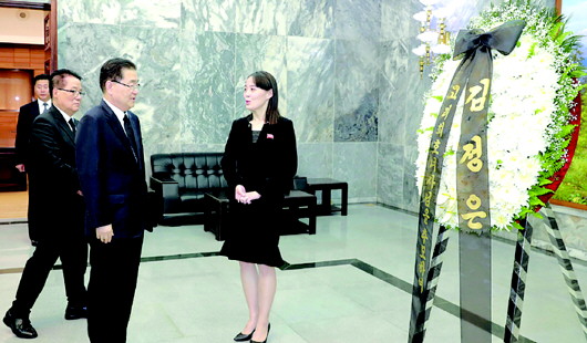12日下午,金正恩的胞妹、朝鲜劳动党中央委员会第一副部长金与正受金正恩委托,在板门店朝方一侧的“统一阁”向韩国官员转交了吊唁信和花圈。金与正还与韩国青瓦台国家安保室长郑义溶、统一部次官徐虎等韩方代表会晤了大约15分钟。