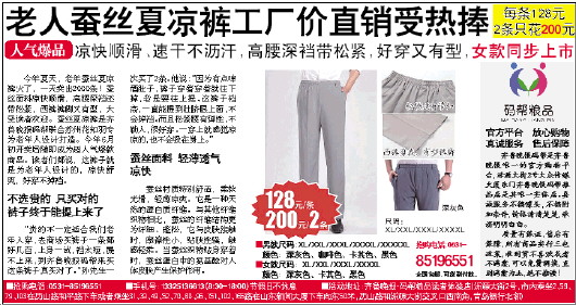 今年夏天,老年蚕丝夏凉裤火了,一天卖出2000条!蚕丝面料凉快顺滑,高腰深裆还带松紧,西裤裤脚又有型,大受读者欢迎。蚕丝夏凉裤是齐鲁晚报码帮联合苏州花知羽专为老年人设计打造。今年6月初开卖后随即成为超人气爆款商品。读者们都说,这裤子就是为老年人设计的,凉快舒爽,好穿不掉裆。