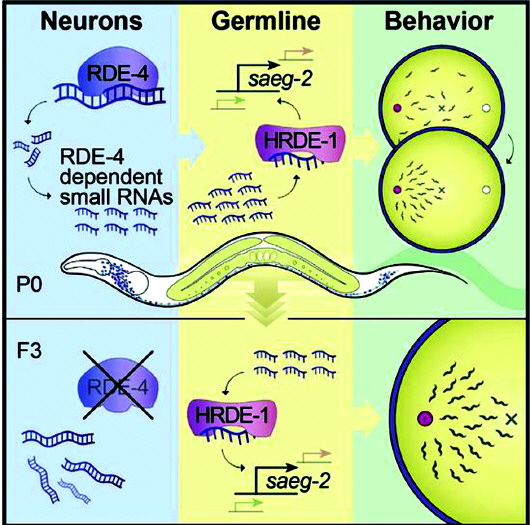 按设想,它们当无法顺利合成许多siRNA。随后,这些研究人员们又在线虫的神经元中特异表达RDE-4蛋白。这样做的目的,是让线虫能够根据神经活动产生siRNA,这方便让科学家观察这些来自大脑的siRNA的作用。接下来的结果令人大感振奋。在通常情况下,这些突变的线虫在较高的温度下,无法顺利找到食物。而当这些线虫的神经细胞中特异表达RDE-4后,这一觅食本领就能得到恢复。这些结果表明,神经细胞中产生的siRNA会影响线虫的觅食行为。而在三代之后,一些线虫后代由于杂交,基因型恢复成了体内缺乏RDE-4蛋白的线虫。按道理,它们应该丧失高温下觅食的本领才对。