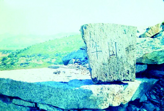 2000年秋天,笔者和几位朋友相约再次去爬卧牛山。从胡同店村向东,然后沿着一条蜿蜒的小道直冲卧牛寨的第一道寨门。当走到一寨门时,发现原来寨门两边的墙体比原来更矮了不少,由寨门上部及两边把子墙坍塌下来的石头堆满了寨门的门洞。踏着石头向里前进时,脚下一块石头突然倾斜反转了一下,笔者下意识地向下看了一眼,竟然发现脚下的石头上有字,于是赶紧招呼朋友过来,大家把有字的这块石头赶忙抬到门洞东边把子墙的石板上安放好,并用当时的胶片相机拍下了这张唯一的石刻图片。