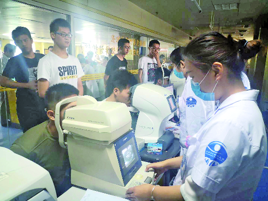 考生排队做近视手术基础检查。