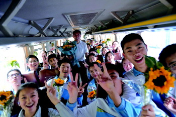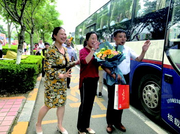 现场大巴车旁,一群手捧鲜花的家长们正在焦急地等待老师和学生,一位姓丁的家长告诉齐鲁晚报·齐鲁壹点记者:“这手捧花是送给新营中学初三八班班主任郭老师的,为了孩子,老师付出了很多,真的辛苦了。这些葵花是送给学生的,希望他们一举夺魁!”