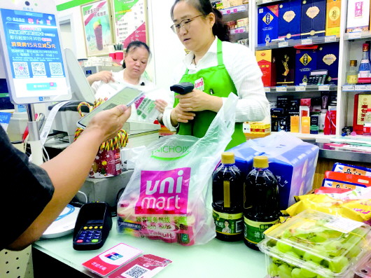 统一银座超市内,塑料袋有偿使用,顾客自愿购买。