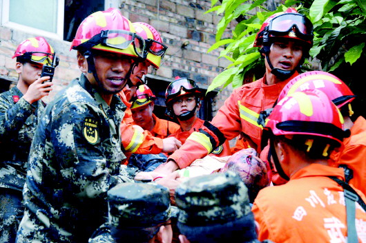 18日,武警宜宾支队官兵在四川长宁县双河镇中学附近一居民房内救出一名重伤员。何云霄 摄