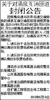 因荣潍高速与济青高速交通转换的涌泉互通交通枢纽匝道需要维修,自2019年6月24日6时至6月30日6时,对S16荣潍高速转至济青高速青岛方向和济南方向的匝道(A、C匝道)进行封闭施工,如遇恶劣天气工期顺延。