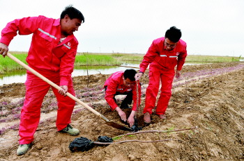 为了让所有封停井现场恢复到原始状态,维持湿地原有的生态平衡,避免外来物种干预,孤东采油厂没有随意选择绿化草种,而是采集油井周边原始生长的碱蓬等植物的种子,播撒在井场,让草种自然生长。