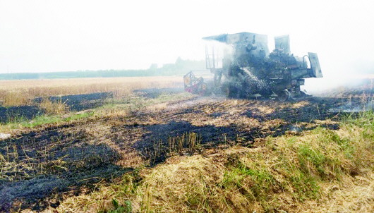 同样的火灾原因,发生在6月15日中午12时许,禹城市公安局莒镇派出所接到群众报警称:莒镇大侯村村北的麦地里一辆收割机故障麦田中自燃,该车不远处还有未收割的麦田,火势较猛,人员无法靠近救火,情况相当危急。接到报警后,消防员立即赶往现场,将火势扑灭。一辆收割机烧成了空架子,但所幸没有造成更大的火势。据了解,收割机起火的原因可能是收割机排气管过热,导致在收割小麦的行进中发生自燃。