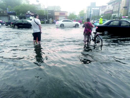 20日傍晚,一阵急雨让济南山大路和花园路交界口附近出现了积水。