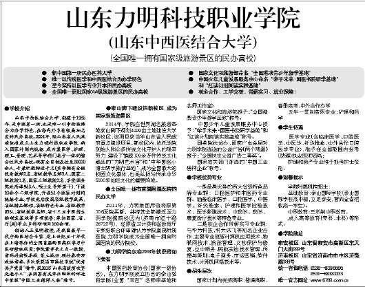 山东中西医结合大学,创建于1985年,是中国第一所、也是唯一以中西医结合为办学特色、在海内外享有较高知名度的民办高校。2001年,经山东省人民政府批准成立山东力明科技职业学院,纳入国家计划内统招,成为集医学、护理、理工、管理、艺术等学科门类于一体的综合性民办高校。现有全日制在校生20000余人,专兼职教师近千名(其中拥有全国优秀教师2名、省级教学名师3人、国家二级教授1名、国家三级教授2名、享受国务院政府津贴2人、硕士生导师若干),下设10余个二级学院,开设51个国家计划内统招专业。学校先后荣获省级教学成果、省级精品课程、省级特色专业、省级教学团队、省级教学名师、省十三五中医药生物研发基地等多项荣誉;承担国家、省、厅(局)等众多科研项目160余项。