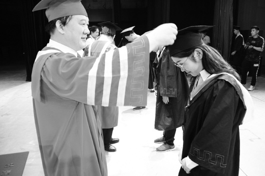 山东华宇工学院执行校长梁玉国为毕业生拨穗正冠。