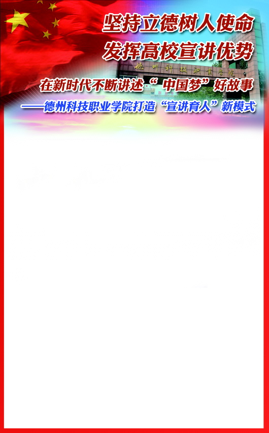 德州科技职业学院于2009年7月,被中共山东省委讲师团授予“中国特色社会主义理论体系宣教基地”,于2015年12月,被中共山东省委讲师团授予“山东省理论宣教基地”。长期以来,在省委、市委讲师团大力支持和积极帮助下,学院宣教基地紧紧围绕“铸魂育人、立德树人”工作主线,坚持“推进理论宣讲、提高宣教质量”的具体要求,积极发挥宣教基地优势,不断提高宣教和宣讲工作质量水平,努力打造“宣讲育人”新模式。